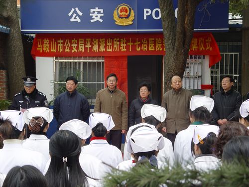 元月8日,马鞍山市公安局平湖派出所驻十七冶医院警务室正式揭牌。市委常委、市政法委书记、市公安局长李群、市卫生局局长王社临等领导出席了揭牌仪式,李群和王社临为十七冶医院警务室揭牌。十七冶医院警务室的正式挂牌成立,对维持医院的正常医疗秩序,维护医患双方的合法权益,保障医护人员和患者的安全,解决突发事件将发挥关键作用,对推进平安医院建设,营造和谐良好的就医环境具有积极的意义。