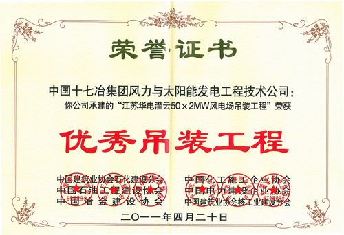 日前,在中国电力建设企业协会、中国冶金建设协会等六家行业协会联合举办的第四届全国工程建设行业吊装市场研讨暨技术交流会上,十七冶风力与太阳能发电工程技术公司承建的江苏华电灌云50×2MW风电场吊装工程荣获优秀吊装工程,论文《沿海滩涂2MW风力发电机组安装技术》获优秀吊装论文。这是该公司自迈入风电建设领域以来,取得的又一项工程建设管理硕果。