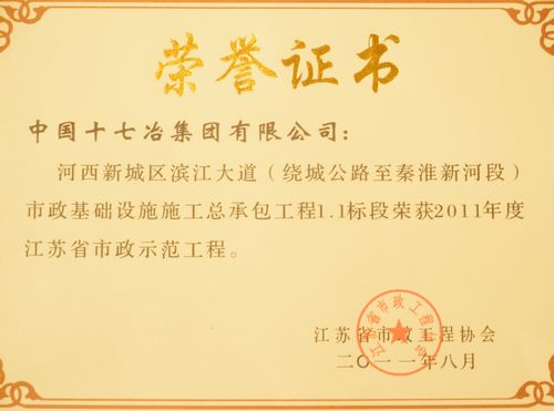 128日,由江苏省市政行业协会组织的江苏省市政行业发展论坛暨2011年度江苏省市政示范工程颁奖大会在苏州会议中心举行。十七冶路桥工程技术公司承建的南京滨江大道项目荣获“2011年度江苏省市政示范工程”称号。