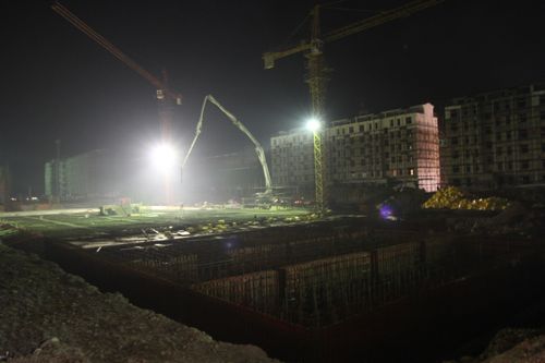 冬天的夜晚来临的特别早。晚上7点时分,夜幕早已拉开。当记者来到今年4月份开工的市经济开发区银塘组团项目时,正赶上项目部在召开项目推进会,房屋工程技术公司总工程师刘家宽、中冶置业(安徽)公司项目经理夏天明以及项目部管理人员正在布置着晚上的加班计划和第二天的施工任务。而此时的工地上早已灯火通明,工程车辆川流不息,各种机械马达声响彻不停。不少楼栋里,员工们挑灯夜战,正抓紧做内墙粉刷。浇筑混凝土、拆模……他们在明亮的灯火下,紧张地忙碌着。该项目共64栋住宅、3252套,今年底计划交房36栋、1234套住宅。
