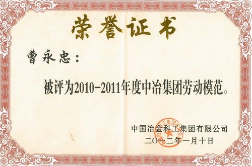 曹永忠同志荣获“中冶集团劳模”荣誉称号