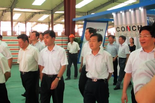 724,山东海螺型材项目施工现场彩旗招展,气氛热烈,山东东营市市长申长友率80余名东营市各级领导来到十七冶城建工程技术公司项目部参观考察。