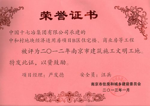 近日,由十七冶南京分公司承建的南京河西中和村项目荣获“2012年南京市建筑施工文明工地”称号。