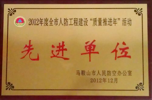 日前,从马鞍山市人民防空办公室获悉,中冶置业(安徽)有限公司获2012年度全市人防工程建设“质量推进年”活动先进单位荣誉称号。