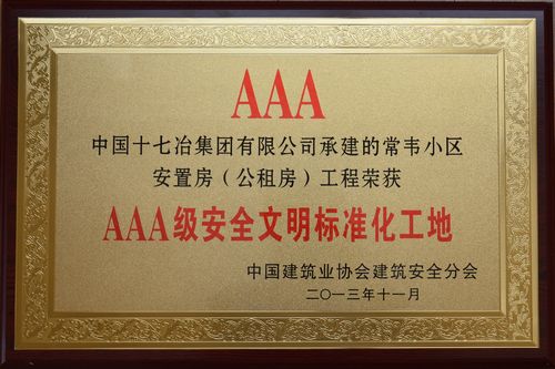 日前,由中国十七冶集团承建的马鞍山市南部示范园区常韦小区安置房(公租房)项目荣获由中国建筑业协会颁发的2013年“AAA级安全文明标准化工地”荣誉称号。