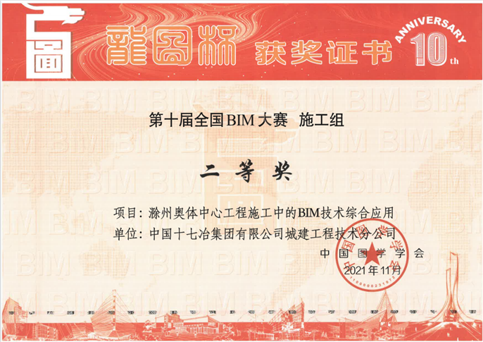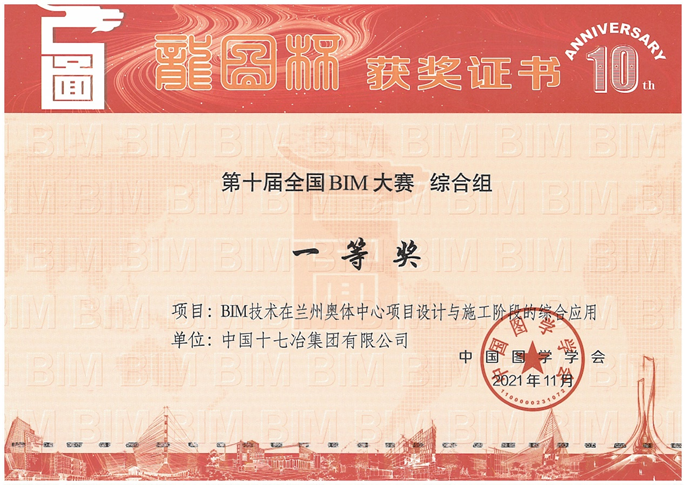 12月28日,中国十七冶集团收到中国图学学会发布第十届“龙图杯”全国BIM(建筑信息模型)大赛组委会颁发的奖状,公司承建的兰州奥体中心一场三馆项目获得一等奖、红星中学整体搬迁项目和滁州奥体中心项目获得二等奖、宝钢湛江项目获优秀奖。