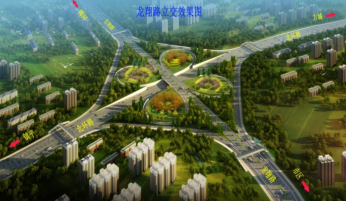 龙祥互通枢纽工程是南阳市中心城区外环路综合开发项目的重要组成部分,对中心城区贯通南北、连接东西具有重要意义。主线龙祥路北段采用双向八车道一级公路标准建设,红线宽度60米,设计时速80公里;主线高架形式的城市主干道标准建设红线宽度50米,设计时速60公里,高架桥宽25.5米,双向六车道。龙祥互通枢纽工程的开工,标志着南阳中心城区外环路项目进入快速实施阶段。