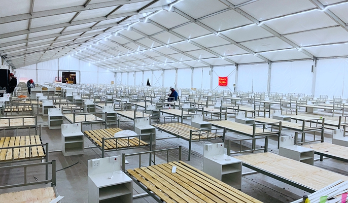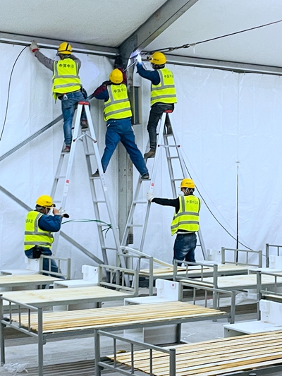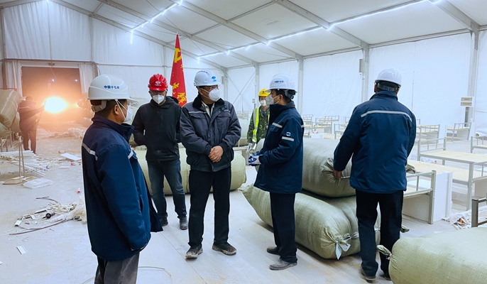 冶金分公司连夜抢装主干线管道、接配隔离舱内电箱线,并协助安装床位插座及呼叫器,确保照明全部安装完成。上海分公司党员突击队加速完成床位铺设安装。房屋分公司党员突击队加班加点搬运物资并推进混凝土浇筑作业。住建分公司党员干部带头到现场开展公共盥洗室、卫生间安装。城建分公司轮班值守快速完成方舱床位及床头柜安装。4月18日夜间至19日清晨,现场全体管理人员穿梭于现场搬运被褥、床头柜、铺设床铺,并分工做好方舱内清洁工作,“决战”最后交付节点。