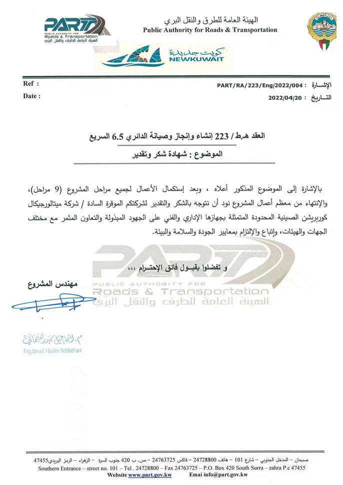 科威特道路与交通公共管理局(PART)发给十七冶的感谢信