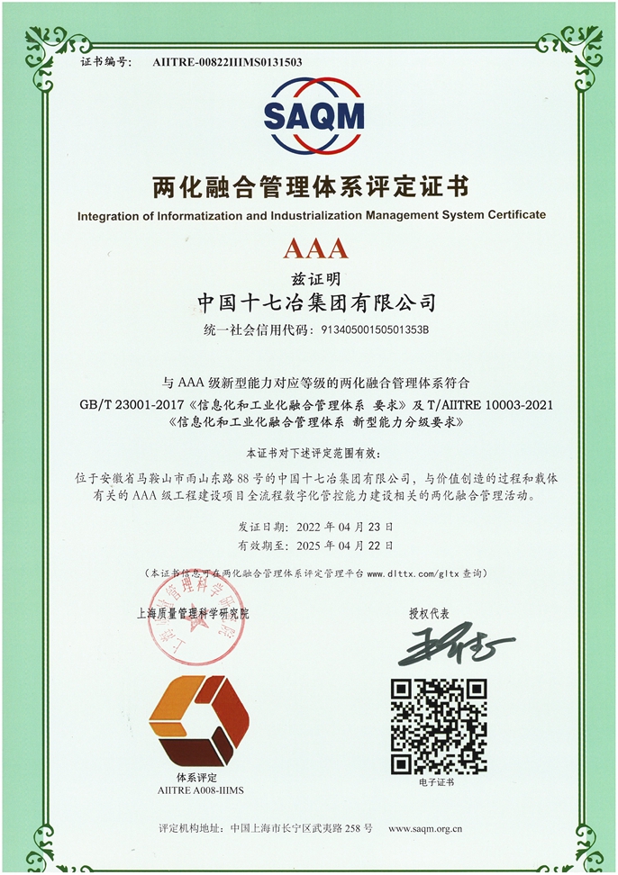 6月15日,中国十七冶集团收到国家工信部颁发的两化融合最高等级AAA级证书,成为安徽省首个通过两化融合管理体系AAA级评定的建筑业企业。