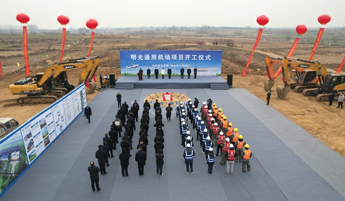 明光通用机场项目位于明光市苏巷镇丁庄,建设内容包括新建一条长1200米、宽30米跑道,1条垂直联络道、8个站坪机位、6300平方米航站综合楼(含塔台)、4135 平方米机库、1400 平方米后勤保障中心以及消防救援、供电、给排水、供冷、供热、供油等配套附属设施。