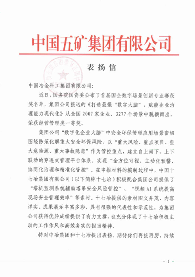 表扬信指出,2023年5月国务院国资委公布首届国企数字场景创新专业赛获奖名单,中国五矿报送的《打造最强“数字大脑”,赋能企业治理能力现代化》从全国2007家企业、3277个场景中脱颖而出荣获经营管理类一等奖。在申报材料的编制过程中,中国十七冶积极配合中国五矿提供了“塔机监测系统辅助塔吊安全风险管控”“视频AI系统提高现场安全管理效率”等素材。素材图文并茂、内容详实、成果展示丰富多彩,具有很强的代表性和示范性,为中国五矿获得优异成绩提供了有力支撑,也充分体现了中国十七冶积极主动的工作作风和高效务实的担当精神。