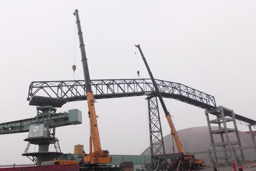 原煤堆场锣锅桁架跨度为57.85m,重约60t,最大安装高度为18.8m。为缩短吊装时间、确保吊装的安全性,项目部采用分段吊装方案,充分利用现场制作的钢结构作为临时支点,采用一台130t吊车和一台70t吊车同时起吊,在临时节点上进行焊接。在吊装过程中,项目部班子成员现场全程跟踪指挥,仅用了4个小时便完成了吊装,为设备安装创造了条件。