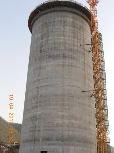 该生料库外径23.4m,高56m,库底板以下壁厚800mm,库底板以上壁厚450mm,其中库底板以上部分滑模仅用时12天到顶。为确保工程质量和安全,项目部编制了专项方案,技术人员24小时全程跟踪。施工期间当地出现倒春寒天气,气温骤降,项目部根据专项方案及时调整了混凝土外加剂比例,确保了混凝土质量和观感,得到业主和监理单位的充分肯定。