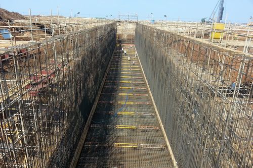 1219下午,湛江钢铁炼钢项目铁合金地下料仓底板一次性通过验收,开始浇筑混凝土。