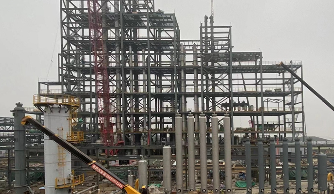 为保证项目按期顺利完工,项目部克服工期紧、任务重、施工难度大等诸多困难,积极与参建各方沟通协调,在劳动力组织、物资供应、机械调配上狠下功夫,千方百计创造作业面,见缝插针加快工程施工进度。此次吊装的四平台钢结构原料系统覆盖1线至10线,总吨位约1700吨,其中2线至3线高度为64.3米,施工难度极高。此次四平台钢结构顺利吊装完成,标志着洛阳中硅电子信息材料项目进入了施工新阶段。
