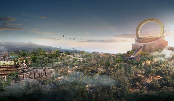 项目位于山东省日照市东港区涛雒镇南,观日台位于天台山顶峰处,海拔高度260米,高度约12米,台上环形构筑物高度约13.5米,整体建筑高度约25.5米;观日台以原始祀日文化功能为立足点,巧妙融合日月星辰文化元素,布设文化标志、天文观赏、逐日天梯等文化景观,具有祭祀祈福、舞台演艺、夜间灯光、科普研学等文化功能。