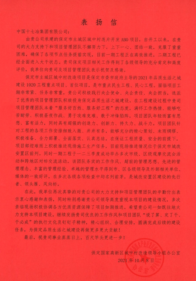 保定国家高新区城中村改造领导小组办公室向十七冶致表扬信