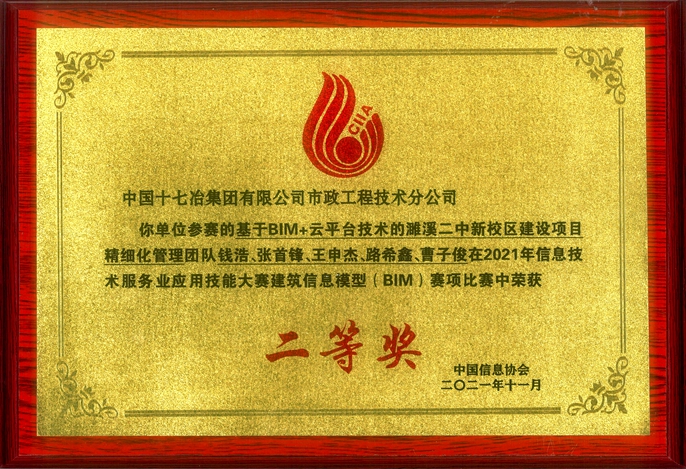 近日,由中国信息协会主办的“2021年信息技术服务业应用技能大赛颁奖典礼”在北京举行,中国十七冶集团市政工程技术分公司在建筑信息模型(BIM)赛项比赛中斩获多项荣誉。“基于BIM+云平台技术的濉溪二中新校区建设项目精细化管理”荣获二等奖,“基于BIM技术的濉溪体育场馆智慧化施工应用”荣获三等奖,“基于BIM+云平台技术的安徽中医药高专后勤综合楼项目精细化管理”荣获优秀奖。