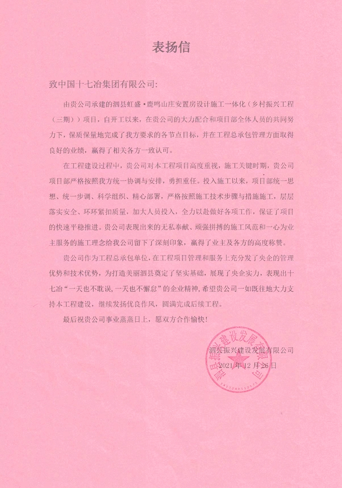 12月26日,泗县振兴建设发展有限公司向中国十七冶集团致感谢信,对泗县鹿鸣山庄施工总承包项目部在工程项目管理和服务上发挥央企的管理和技术优势,为打造美丽泗县作出的积极贡献提出表扬。