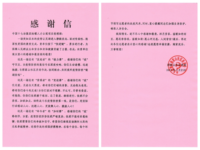 感谢信中提到,面对突如其来的疫情,十七冶海螺人才公寓项目部主动请缨,迅速驰援,与邢家山社区并肩作战、协同配合,共同筑牢疫情防控的“镜湖防线”展现了十七冶服从大局、勇于担当的央企形象。