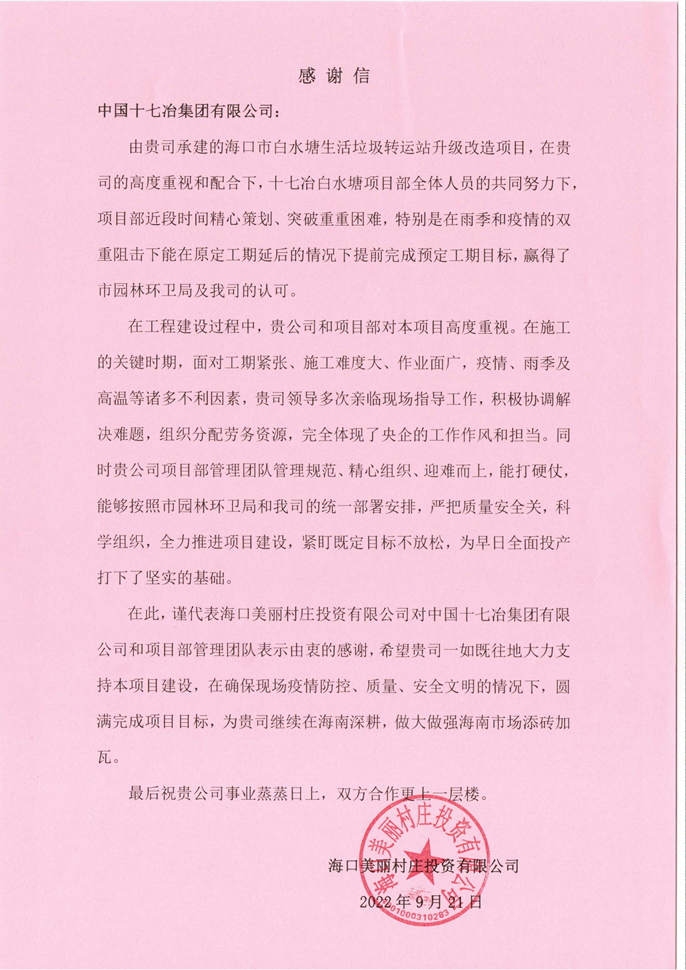 9月27日,中国十七冶集团收到海口美丽村庄投资有限公司致来的感谢信,对冶金分公司海口市白水塘生活垃圾转运站升级改造项目部在疫情和雨季的双重阻击下提前完成预定工期目标表示感谢。