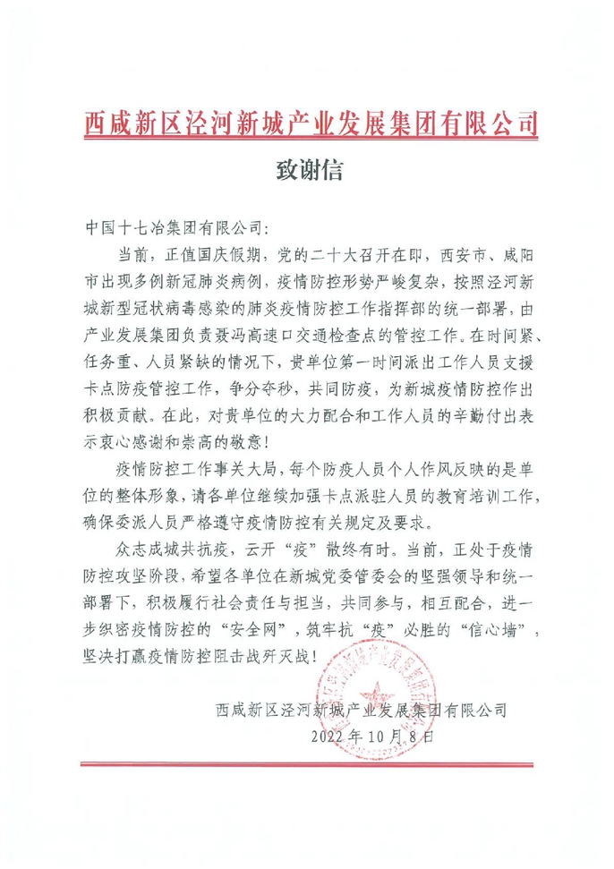10月11日,中国十七冶集团收到西咸新区泾河新城产业发展集团有限公司发来的感谢信,对陕西分公司泾河新城秦创原1980泾造中心项目在疫情防控工作中提供的支持与帮助表示感谢。