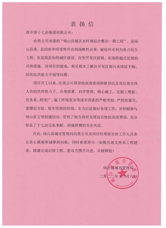 表扬信中指出,砀山县城区水环境综合整治一期工程EPC项目是宿州市重点民生工程,项目建成后将从根本上解决开发区雨污水排放不畅,防汛抗洪能力不强的问题。项目开工以来,在中国十七冶集团领导的高度重视、督导以及项目部全体人员的共同努力下,项目部合理部署、科学管理、精心施工,克服工期紧、任务重、跨度广、施工环境复杂等诸多因素的严峻考验,严把质量关、紧绷安全弦、筑牢疫情防控线,全力以赴做好各项工作,并积极参与砀山县文明创建活动,受到了地方政府及周边百姓的高度赞扬,充分彰显了十七冶无私奉献、顽强拼搏的央企风范。