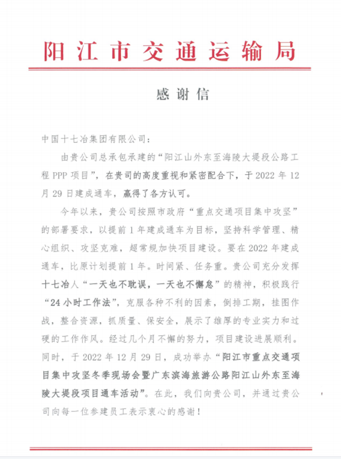 12月30日,阳江市交通运输局向中国十七冶致感谢信,对交通分公司项目部确保阳江山外东至海陵大堤段公路工程顺利通车、为阳江市交通基础设施建设做出的积极贡献给予表扬与感谢。