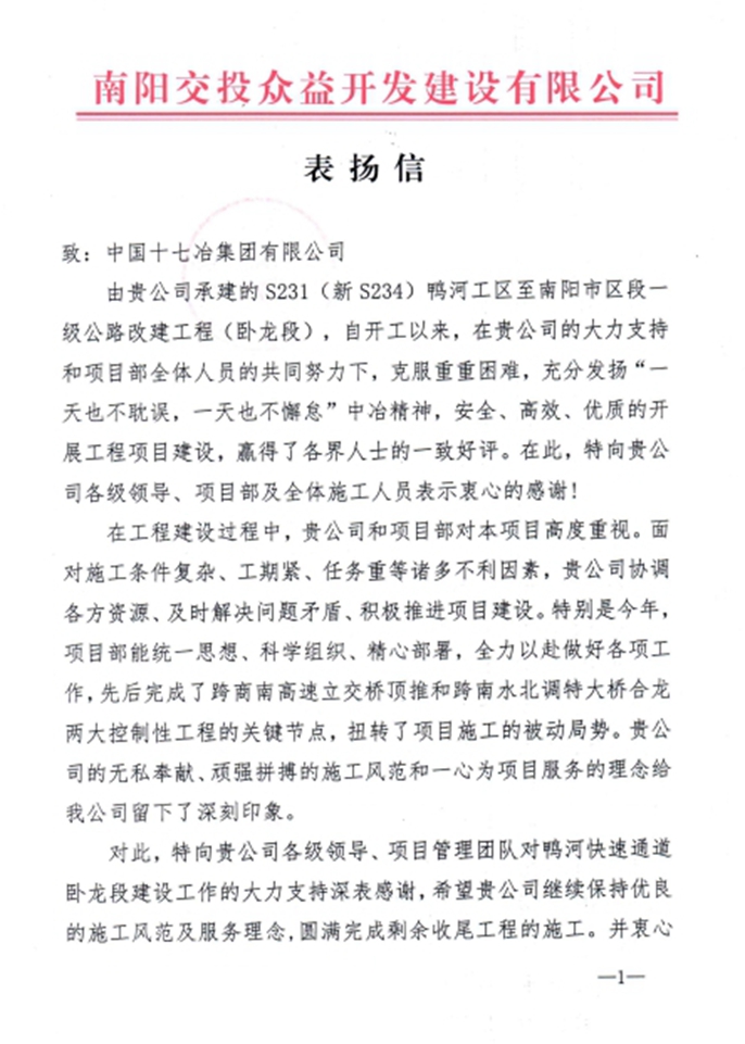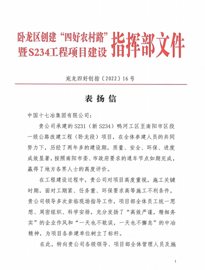 近日,南阳市卧龙区S234工程项目建设指挥部、南阳交投众益开发建设有限公司向中国十七冶致表扬信,对路桥分公司S231(新S234)鸭河工区至南阳市区段一级公路改建工程(卧龙段)项目团队安全、高效、优质开展项目建设并按照市委、市政府要求完成通车目标给予表扬并致以感谢。