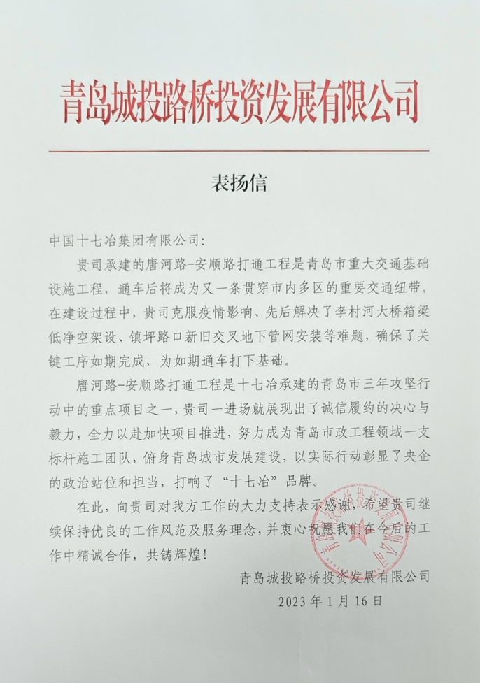 表扬信中指出,唐河路-安顺路打通工程是十七冶承建的青岛市三年攻坚行动中的重点项目之一,十七冶项目团队自进场以来就展现出了诚信履约的决心与毅力,全力以赴加快项目推进,努力成为青岛市政工程领域一支标杆施工团队,俯身青岛城市发展建设,以实际行动彰显了央企的政治站位和担当,打响了“十七冶”品牌。
