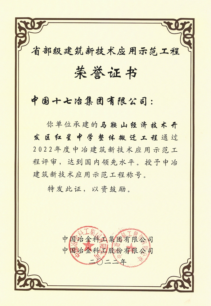 近日,中国十七冶房屋分公司承建的马鞍山市经开区红星中学整体搬迁工程通过2022年度中冶建筑新技术应用示范工程评审,达到国内领先水平,被中冶集团授予“省部级建筑新技术应用示范工程”称号。
