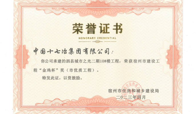 近日,从安徽省宿州市住房和城乡建设局获悉,中国十七冶承建的宿州泗县城市之光二期工程、宿州生物医药科技园工程4#-7#楼两项目荣获宿州市建设工程“金鸡杯”优质工程奖。