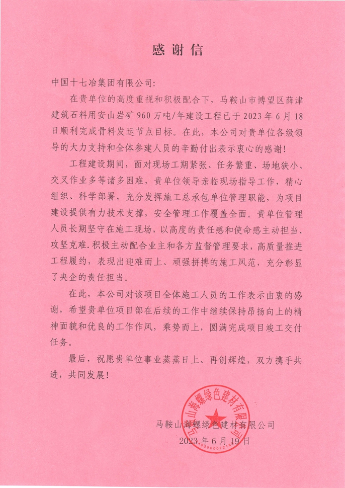 6月28日,马鞍山海螺绿色建材公司向中国十七冶集团发来感谢信,对马鞍山海螺绿色建材项目团队克服种种困难,于6月18日顺利完成工程骨料发运节点目标表示衷心感谢。