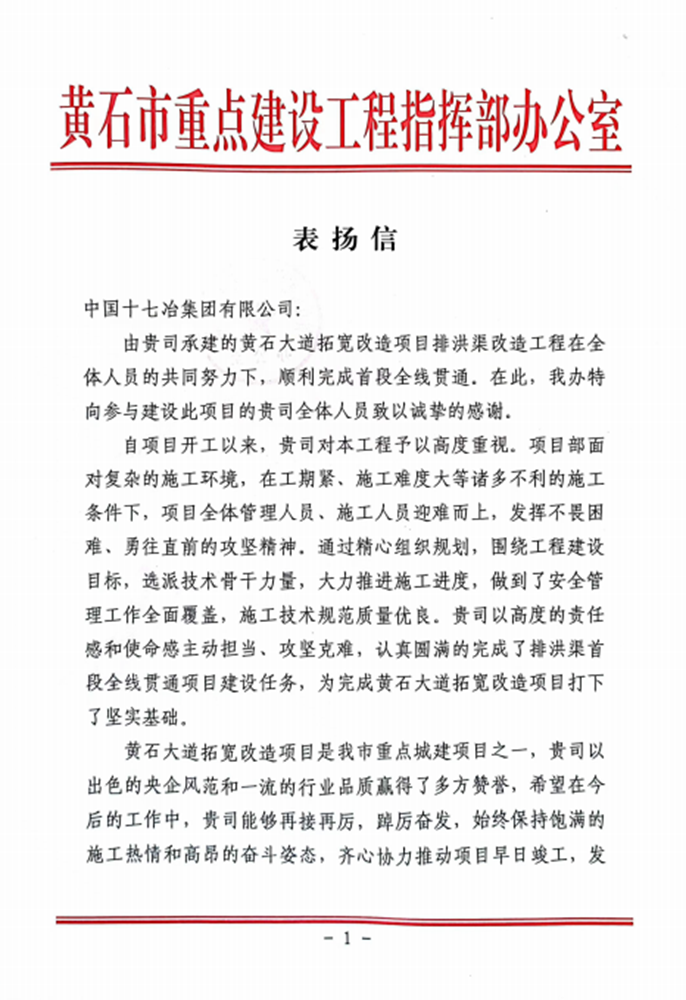 9月19日,黄石市重点建设工程指挥部办公室向中国十七冶集团致表扬信,对建安分公司项目团队顺利完成黄石大道拓宽项目排洪渠改造工程首段贯通节点表示感谢。