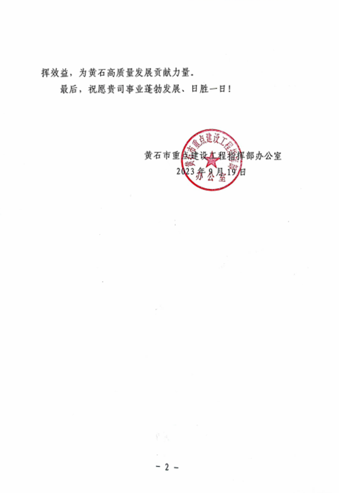 信中指出,项目开工以来,项目部全体管理人员、施工人员难而上,发挥不畏困难、勇往直前的攻坚精神。通过精心组织规划,围绕工程建设目标,选派技术骨干力量,大力推进施工进度,做到了安全管理工作全面覆盖,施工技术规范质量优良。中国十七冶以高度的责任感和使命感主动担当、攻坚克难,认真圆满地完成了既定任务,为完成黄石大道拓宽改造项目打下了坚实基础。