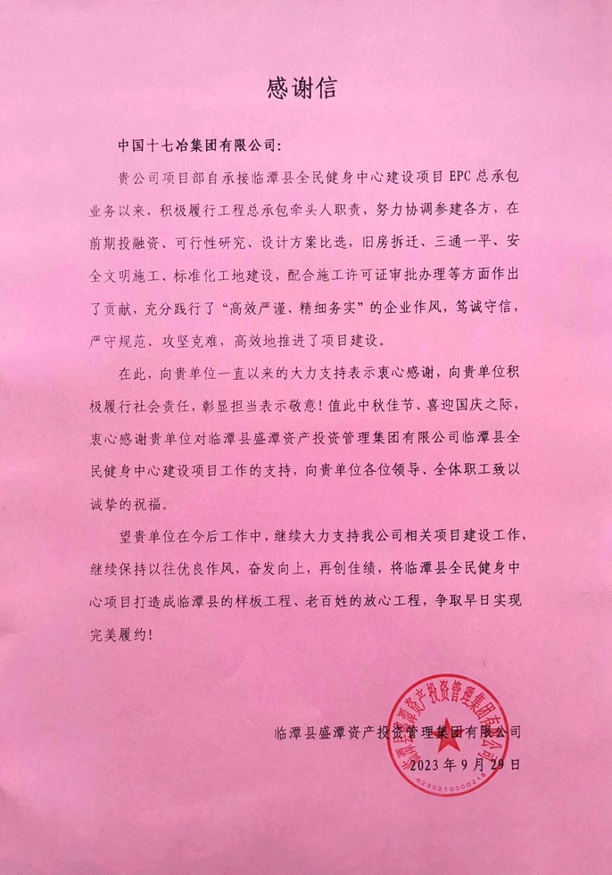 9月29日,临潭县盛潭资产投资管理集团有限公司向中国十七冶集团致感谢信,对临潭全民健身中心项目团队积极推进项目建设表示肯定与感谢。