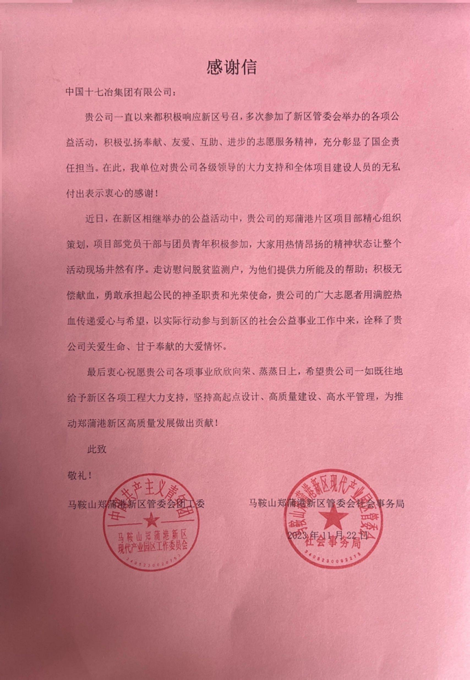 11月22日,马鞍山市郑蒲港新区管委会团工委、社会事务局向中国十七冶集团致感谢信,对住建分公司郑蒲港片区项目团队践行央企担当,多次参加新区公益活动表示感谢。