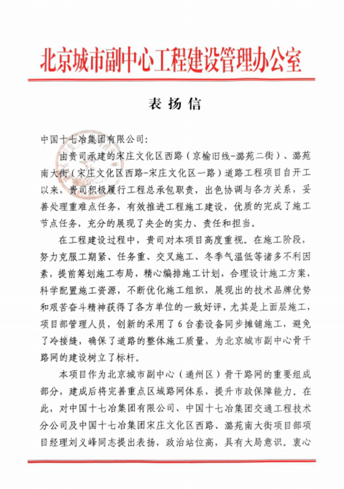 北京城市副中心建管办向中国十七冶致表扬信