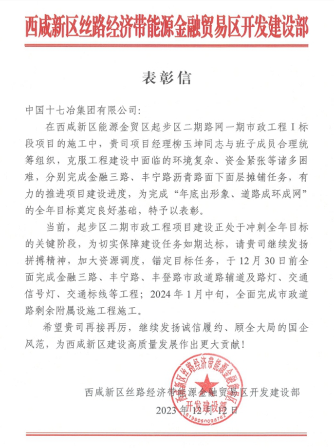 12月20日,西成新区丝路经济带能源金融贸易区开发建设部向中国十七冶致表彰信,对路桥分公司西咸新区能源金贸区起步区二期路网一期市政工程I标段项目团队高效推进项目进度提出表扬。