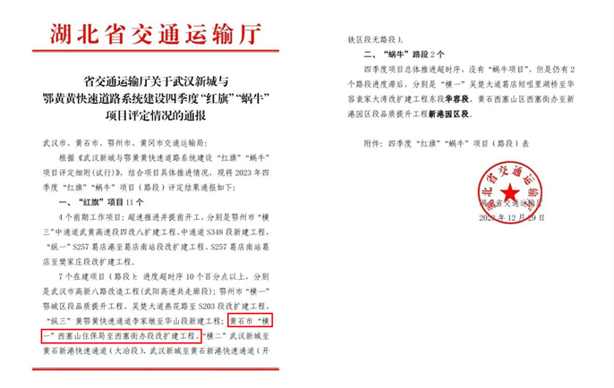 近日,湖北省交通厅发布武汉新城与鄂黄黄快速道路系统建设四季度“红旗”项目评定情况,对项目进度超前、快速推进提出表扬,中国十七冶黄石大道拓宽及生态改造项目西塞山住保局至西塞街办段改扩建工程成为11个入选的“红旗”项目之一。