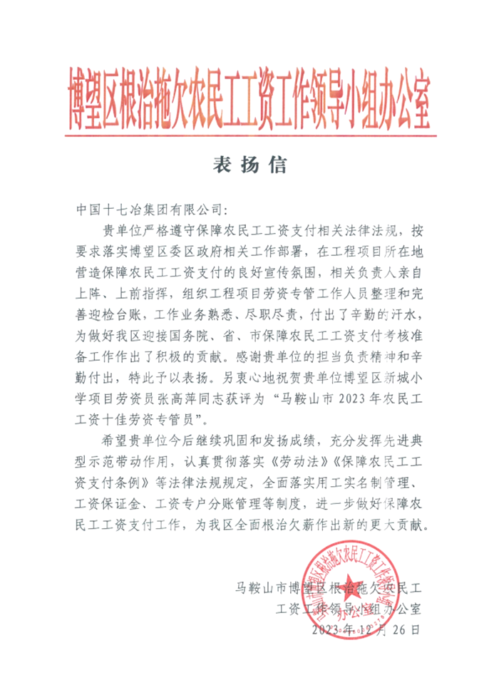 近日,马鞍山市博望区根治拖欠农民工工资工作领导办公室向中国十七冶集团致表扬信,积极做好保障农民工工资支付工作,为博望区全面根治欠薪作出突出贡献提出表扬,对博望区新城小学项目部管理人员荣获市“农民工工资十佳劳资专管员”给予祝贺。
