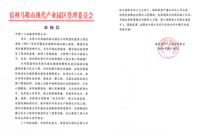 信中指出,自项目开工以来,十七冶项目团队站位高、讲政治、顾大局,与园区政府各相关部门紧密协同,在施工过程中始终坚持以品质树标杆、以匠心筑精品,科学统筹谋划,精心安排部署,以出色的管理水平、扎实的工作作风、有力的管理举措,实现项目安全、质量、进度、环保等方面管理“齐头并进”,努力打造宜居、安居的高标准住宅,先后获评宿州市安全生产标准化示范工地、宿州市推进重点项目建设先进集体等荣誉称号,为保障园区重点民生工程有序推进作出了重要贡献。