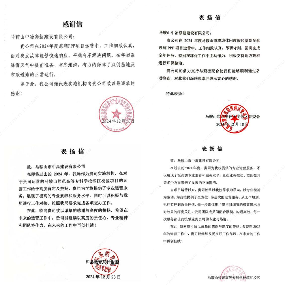 马鞍山慈湖高新区投资发展有限公司在致中冶高新的感谢信中指出,中冶高新在慈湖PPP项目运营中,工作细致认真,面对突发故障能够快速响应平稳有序解决问题。特别是在年初强降雪天气中提前准备、有序组织,有力保障了双创基地及市政道路的正常运行;市濮塘休闲度假区管委会在致中冶濮塘的表扬信中指出,中冶濮塘在马鞍山市濮塘休闲度假区基础配套设施 PPP项目运营中,工作细致认真、尽职守则,圆满完成全年任务;市师范高等专科学校滨江校区及和县教育局在致中禹建设的表扬信中指出,项目运营以来,项目团队始终以学校需求为导向,以专业精神为驱动,为校园提供了全方位、多层次的运营服务,从工作规划、执行监控到效果评估,都体现了项目团队对细节的极致追求与对效果的深度关注。