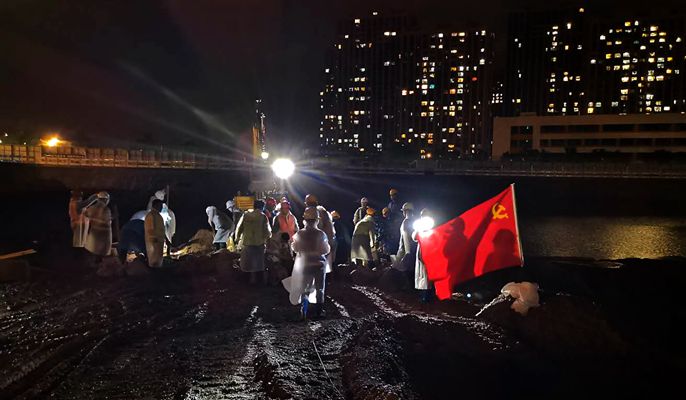 一直多达50人的抢险队,浩浩荡荡,迅速到达指定的抢险位置,面对华灯初上的居民生活楼,项目部全体人员一齐喊着“保证完成任务!”项目部旋即分配各自任务。党员同志去最紧要的地方,新员工留驻安全的地区,做好协助工作。分工一经明确,项目全体人员如火如荼地冒着雨、顶着风干了起来,你牵着袋、我挖土沙,短时间内完成800袋土封堵任务,并组织一台挖机,及时作业,抢险守家园。
