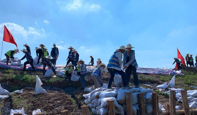 连续一个月的强降雨导致巢湖水位达到历史极值,为尽快将巢湖水位降到历史最高点以下,和县裕溪河、牛屯河被最大限度提高分洪流量,水位持续上涨并有长时间保持高水位态势,堤岸防汛压力骤然增加。7月31日中午,一支由中国十七冶集团郑蒲港片区、和县片区、智慧小镇、向山项目部联合组成的182人抗洪抢险突击队,迅速集结奔赴前往马鞍山市和县新塘村、汤城村,对堤坝进行打桩和增高加固,全力奋战,守护堤坝安全。
