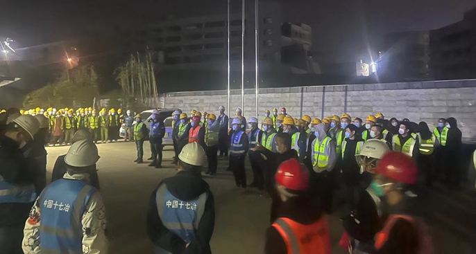 11月28日凌晨,中国十七冶集团陕西分公司汉中市“两院一中心”项目星夜集结,前往汉山广场搭建隔离帐篷。